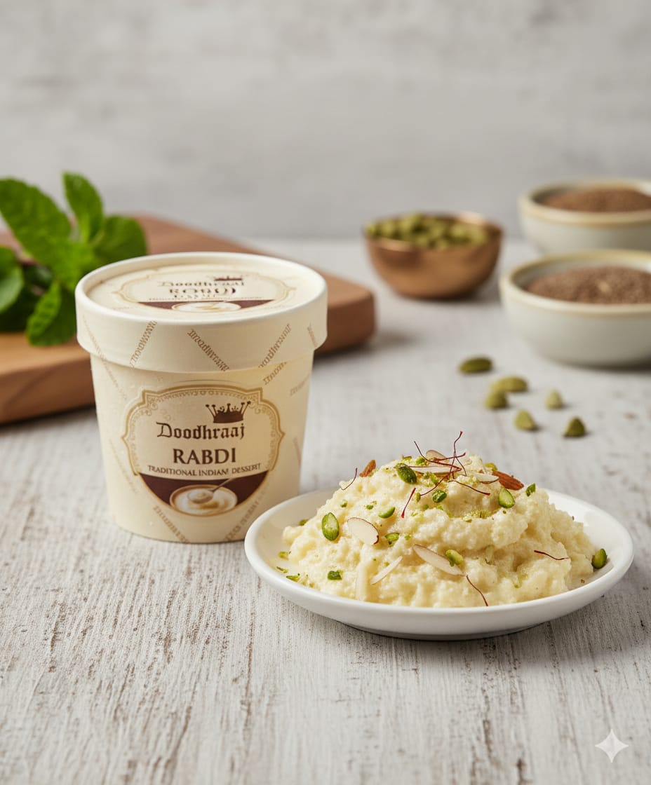 Traditional Indian Rabdi by Doodhraaj traditional slow-cooking method se tayaar ki jaati hai, jahan full cream milk ko dheere-dheere paka kar naturally thick aur flavourful banaya jaata hai. Har spoon mein milta hai pure milk ka richness aur ghar jaisa authentic swaad—bilkul waise jaise pehle zamane mein banayi jaati thi rabdi.