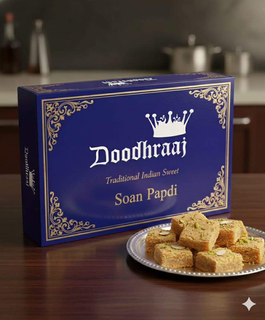 Soan Papdi by Doodhraaj is traditionally prepared using high-quality gram flour, pure ghee, and sugar, cooked carefully to create its signature fibrous texture. Finished with a touch of cardamom and garnished with dry fruits, this mithai reflects authentic Indian sweet-making craftsmanship.